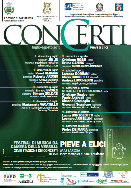 A esibirsi sul palco della bellissima chiesa di S. Pantaleone troveremo Pavel Berman al violino e Roberto Arosio al pianoforte (domenica 12 luglio, musiche di Grieg, Chausson, Schumann e Weinawski); Simone Soldati al pianoforte ed Enrico Bronzi al violoncello ( domenica 19 luglio con musiche di Bach e Beethoven); Mariangela Vacatello, che a Pieve a Elici ha debuttato con grande successo nel 2013 e che domenica 26 luglio interpreterà musiche di Schumann, Chopin, Liszt e Ginastera.