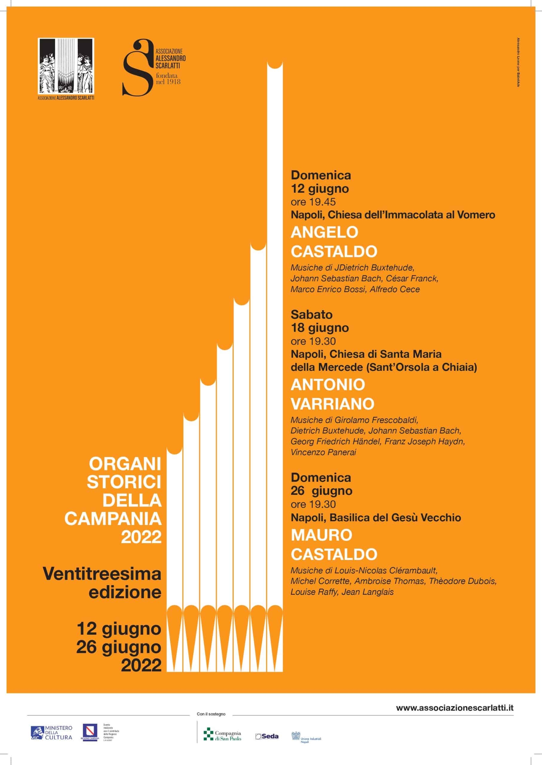 Domenica 12 giugno 2022 alle ore 19.45 la ventitreesima edizione del ciclo Organi Storici della Campania inaugura nella Chiesa dell’Immacolata al Vomero con un concerto l’organista Angelo Castaldo. Protagonista sarà il poderoso Organo Mascioni in legno di cedro del 1984, recentemente sottoposto ad una revisione che ha riportato lo strumento all’originario splendore. Seguiranno altri due appuntamenti a Napoli nel mese di giugno: sabato 18 giugno alle ore 19.45 il concerto di Antonio Varriano si terrà nella Chiesa di Santa Maria della Mercede (Sant’Orsola a Chiaia), e domenica 26 giugno l’organista Mauro Castaldo sarà alle ore 19.30 nella Basilica del Gesù Vecchio. La rassegna proseguirà nei mesi di settembre e ottobre con altri 6 appuntamenti alla scoperta di strumenti storici su tutto il territorio regionale. Nato nel 2001 e dedicato alla scoperta e alla valorizzazione del vasto patrimonio organario della nostra Regione, il ciclo ha realizzato più di 100 concerti e oltre a passare in rassegna gli organi di Napoli ha spaziato in tutta la Campania in prestigiose sedi quali il Santuario di San Rocco a Lioni, la Chiesa di Santa Maria della Speranza a Battipaglia, la Chiesa di Sant’Antonio al Seggio di Aversa, il Santuario di Sant’Antonio di Afragola , la cinquecentesca Collegiata di San Michele a Solofra. I concerti sono gratuiti fino ad esaurimento posti Per il programma completo cliccare qui Programma |