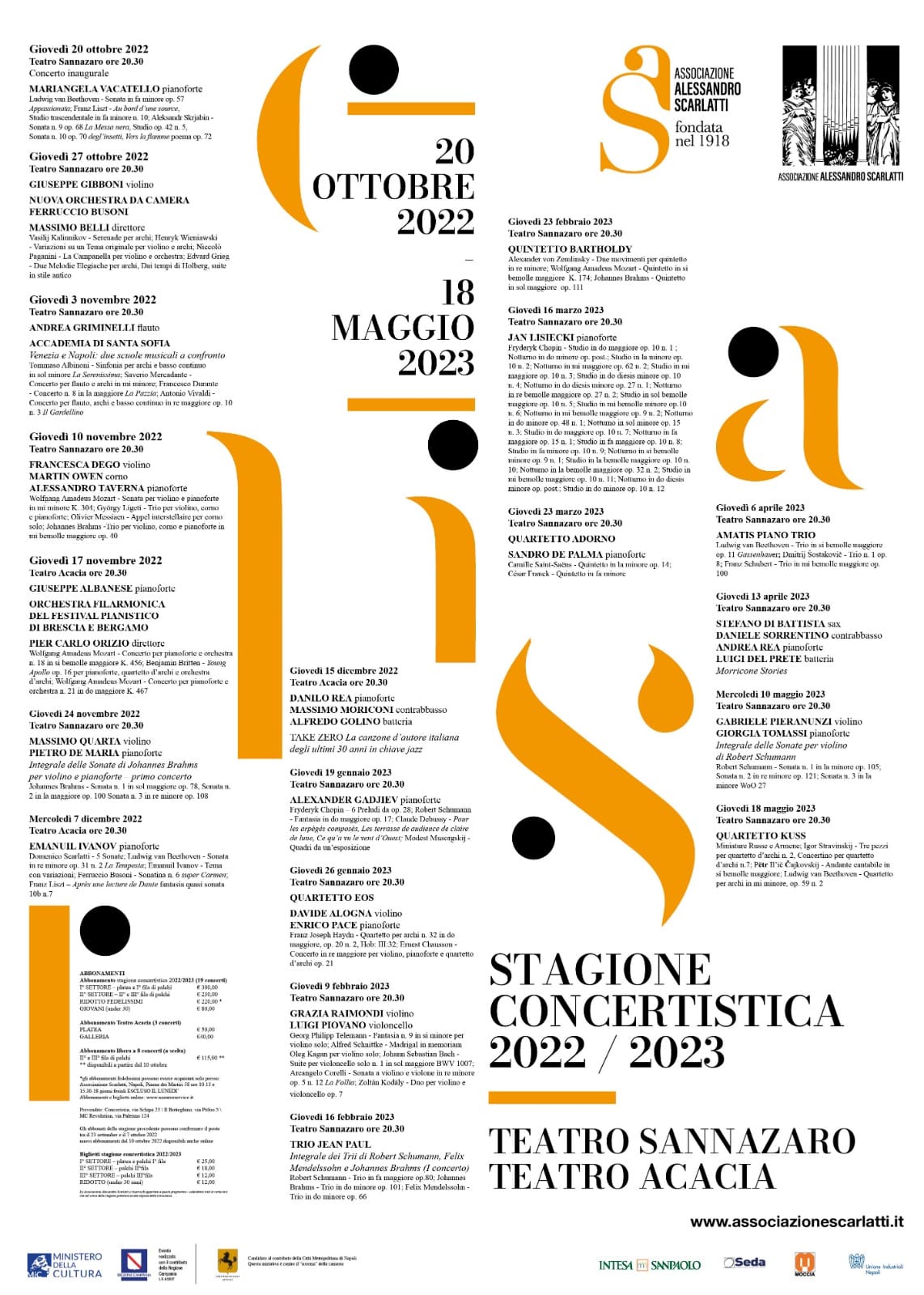 L’Associazione Alessandro Scarlatti presenta per la Stagione Concertistica 2022/23 una programmazione di livello internazionale, in linea con le sue grandi tradizioni. La stagione sarà inaugurata il 20 ottobre 2022 e si concluderà il 18 maggio 2023 per un totale di 19 concerti. Una agguerrita squadra di eccellenti pianisti innerva una stagione ricca di sorprese, con proposte musicali che ruotano attorno al grande repertorio classico, con alcune significative incursioni nel jazz di qualità. L’inaugurazione, il 20 ottobre 2022 alle ore 20.30 al teatro Sannazaro, è affidata a Mariangela Vacatello, ospite recente della stagione del Teatro alla Scala e di grandi istituzioni come l’Orchestra Nazionale della RAI; Giuseppe Albanese, artista Deutsche Gramophone, si esibirà con l’Orchestra del Festival Internazionale di Brescia e Bergamo diretta da Pier Carlo Orizio eseguendo due splendidi concerti di Mozart il 17 novembre 2022 al Teatro Acacia; uno spazio importante viene dedicato a due recenti vincitori di importanti concorsi internazionali come Emanuil Ivanov (Primo Premio Busoni 2019, il 7 dicembre 2022 al Teatro Acacia ) e Alexander Gadjiev (secondo premio e premio Krystian Zimerman al XVIII concorso Chopin di Varsavia e BBC New Generation Artist 2019-2022 il 19 gennaio 2023 al Teatro Sannazaro); un recital interamente dedicato a Chopin vedrà impegnato il 16 marzo 2022 alle ore 20.30 al teatro Sannazaro il pianista canadese Jan Lisiecki, che si è esibito sotto la guida di grandi direttori come Claudio Abbado, Valeri Gerghiev, Antonio Pappano Tra i violinisti spicca la presenza di ben due premi Paganini, seppur separati da una generazione: Giuseppe Gibboni, impegnato con la Nuova Orchestra Ferruccio Busoni, diretta da Massimo Belli il 27 ottobre 2022 e Massimo Quarta, che, con il pianista Pietro De Maria realizzerà l’integrale delle Sonate per violino e pianoforte di Johannes Brahms il 24 novembre 2022. Di assoluto interesse anche l’integrale delle Sonate per violino e pianoforte di Robert Schumann che Gabriele Pieranunzi e Giorgia Tomassi porteranno all’attenzione del pubblico napoletano il 10 maggio 2023, mentre altra presenza violinistica di assoluto valore è rappresentata da Francesca Dego che con Alessandro Taverna (pianoforte) e Martin Owen (corno) darà vita a un programma cameristico che spazierà da Mozart a Messiaen, da Brahms a Ligeti, il 10 novembre 2022 sempre al Teatro Sannazaro. La stagione ospiterà anche alcuni ensemble cameristici di livello internazionale come il Trio Jean Paul il 16 febbraio 2023, il Quintetto Bartholdy il 23 febbraio 2023, il Trio Amatis il 6 aprile 2023 , il Quartetto Kuss a concludere degnamente la Stagione il 18 maggio 2023, mentre uno spazio importante viene dato a due eccellenti quartetti italiani: e il Quartetto Eos, che, con il pianista Enrico Pace e il violinista Davide Alogna eseguirà il bellissimo concerto di Chausson per violino, pianoforte e quartetto d’archi il 26 gennaio 2023, e il Quartetto Adorno, impegnato con il pianista Sandro De Palma in due capolavori assoluti come il Quintetto di Saint-Saëns e il Quintetto di Franck il 23 marzo 2023, il tutto al Teatro Sannazaro alle ore 20.30 . Giovedì 9 febbraio 2023 di grande interesse il programma presentato dalla violinista Grazia Raimondi insieme con il violoncellista Luigi Piovano (primo violoncello dell’Orchestra dell’Accademia Santa Cecilia) mentre il virtuosismo del flautista Andrea Griminelli sarà supportato dalla bella sonorità degli archi della Accademia di Santa Sofia, emergente orchestra da camera campana, il 3 novembre 2022. Due interessantissimi progetti vedono poi impegnati due jazzisti italiani di riferimento come il pianista Danilo Rea, che propone il 15 dicembre 2022 al Teatro Acacia un originalissimo viaggio nella canzone italiana degli ultimi trent’anni, e Stefano Di Battista, con un omaggio alla musica di Ennio Morricone il 13 aprile 2023 al Teatro Sannazaro. |