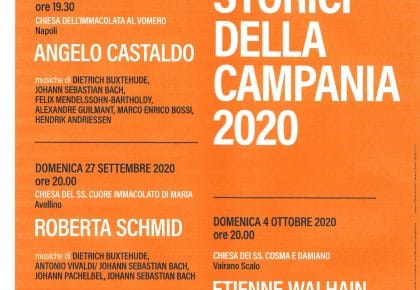 Domenica 20 settembre 2020 – ore 19.30 Napoli – Chiesa dell’Immacolata al Vomero Angelo Castaldo, organo Dietrich Buxtehude – Praeludium in G Minor BuxWV 149; Johann Sebastian Bach – O Mensch, bewein’ dein’ Sunde gross BWV 622; Felix Mendelssohn-Bartholdy –...